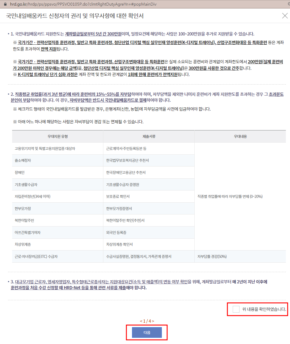 6. 신청자의 권리 및 의무사항에 대한 확인서 창이 나타납니다. 총 4페이지입니다. 확인란에 체크하시고 [다음]을 클릭하세요.