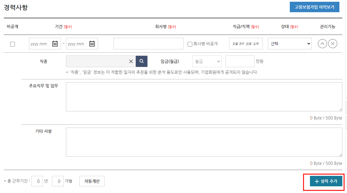 직종, 임금, 주요직무 및 업무, 기타 사항은 간단히 입력하셔도 무방합니다. [항목 추가]하면 추가 입력창이 생성됩니다.