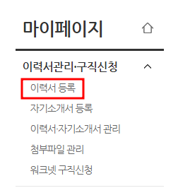 3. 홈페이지 왼쪽의 마이페이지에서 [이력서 등록]을 클릭합니다.