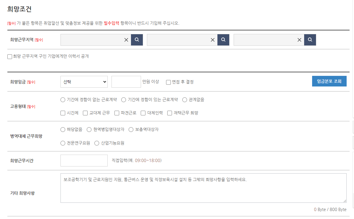 8. 희망조건 작성합니다. 희망근무지역, 희망임금, 고용형태는 반드시 작성하세요. 병역대체 근무희망, 희망근무시간, 기타 희망사항은 선택사항입니다.