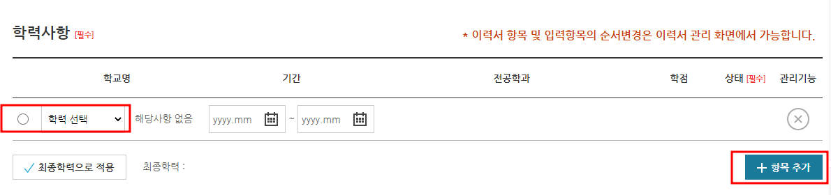 5. 학력사항 입력하세요. 학교명과 재학 기간을 작성합니다. [항목 추가]를 클릭하면 입력 창이 추가로 생성됩니다.