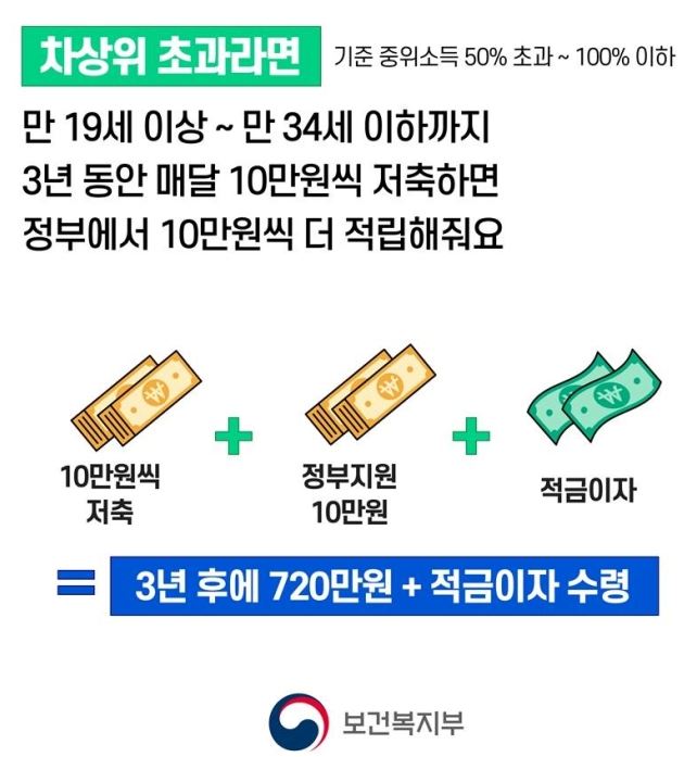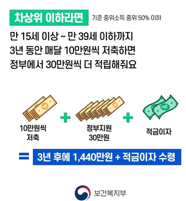 다시 말해서, 3년간 기준중위소득 50% 이하 청년은 원금 360만원, 정부지원금 1,080만원과 은행이자를 지급받고, 기준중위소득 100% 이하인 청년은 원금 360만원, 정부지원금 360만원과 은행이자를 지급받습니다.